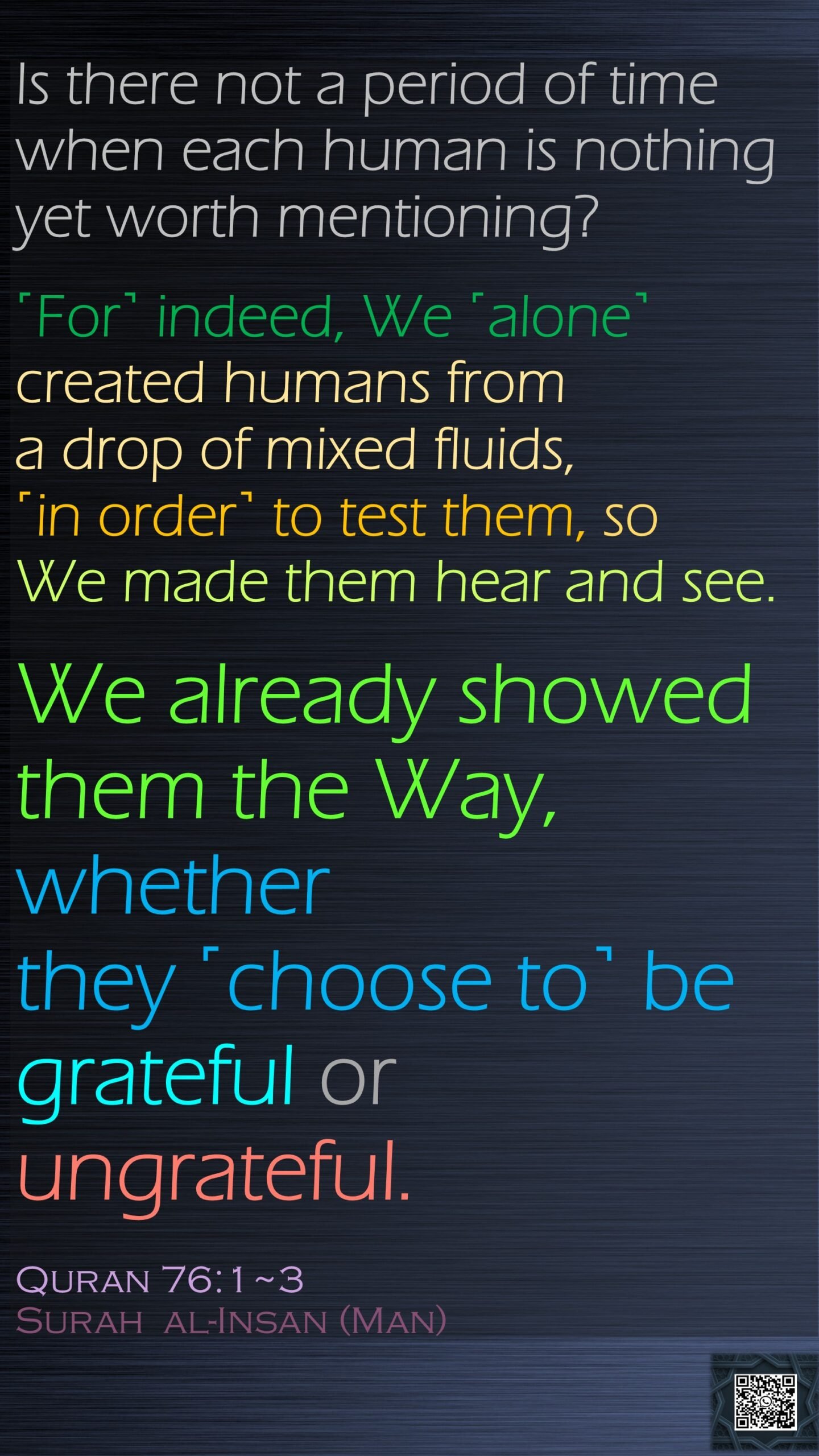 076, 76, Allah, alone, ayat, choose, daily, grateful, heare, human, in order, indeed, insan, islamic, man, mentioning, mixed fluids, nothing, period, quran, see, show, Surah, test, time, ungrateful, way