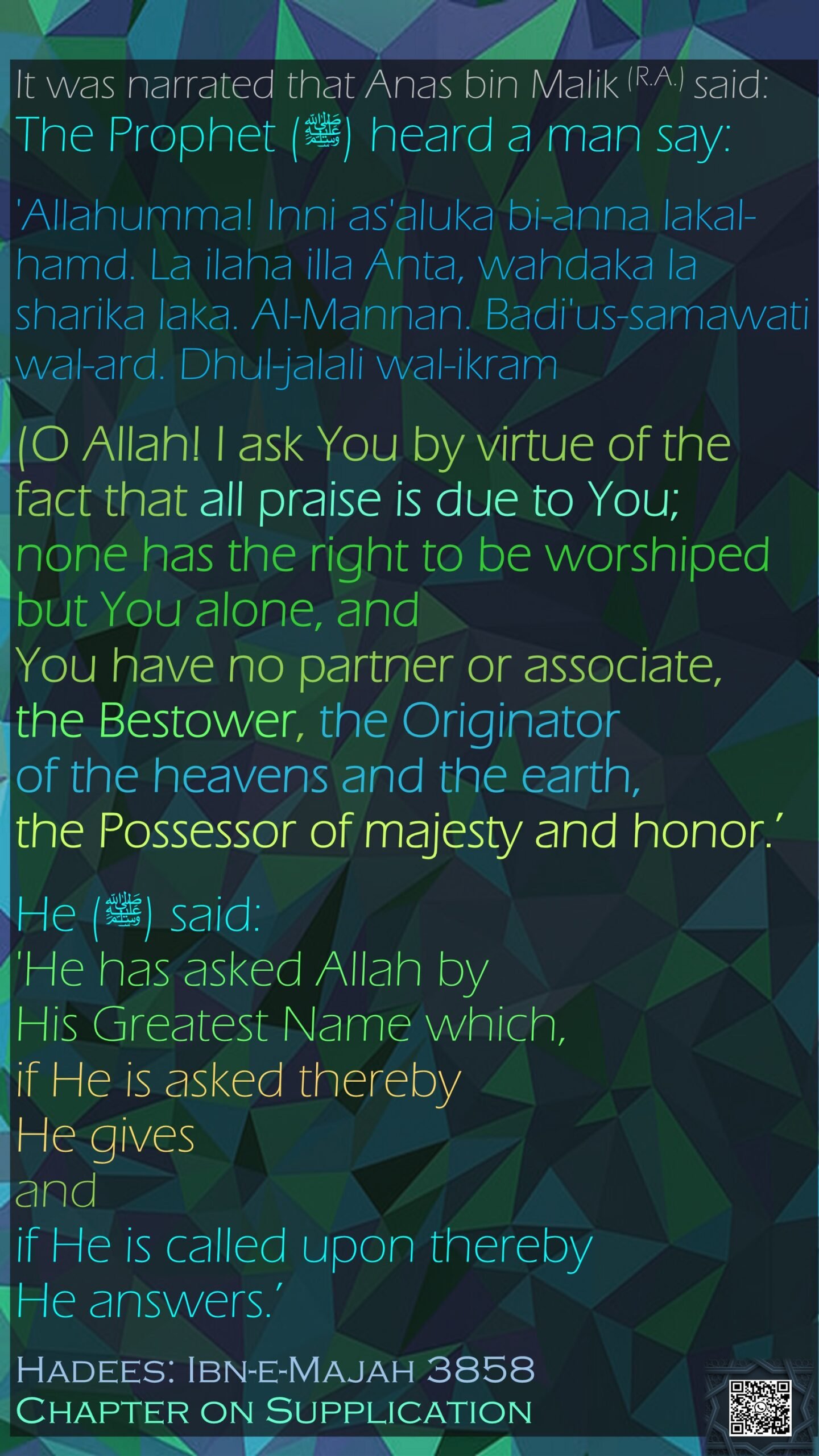 3858, Allah, answer, ask, bestower, daily, earth, give, Greatest Name of Allah, hadith, honor, Ibn-e-Majah, inspirations, instantaneous, islam, islamic, Ism-e-Azam, Muhammad, no partner, originator, possess, praise, worship, الْمَنَّانُ, بِأَنَّ لَكَ الْحَمْدَ, بَدِيعُ السَّمَوَاتِ وَالْأَرْضِ, ذُو الْجَلَالِ وَالْإِكْرَامِ, لَا إِلَهَ إِلَّا أَنْتَ, وَحْدَكَ لَا شَرِيكَ لَكَ