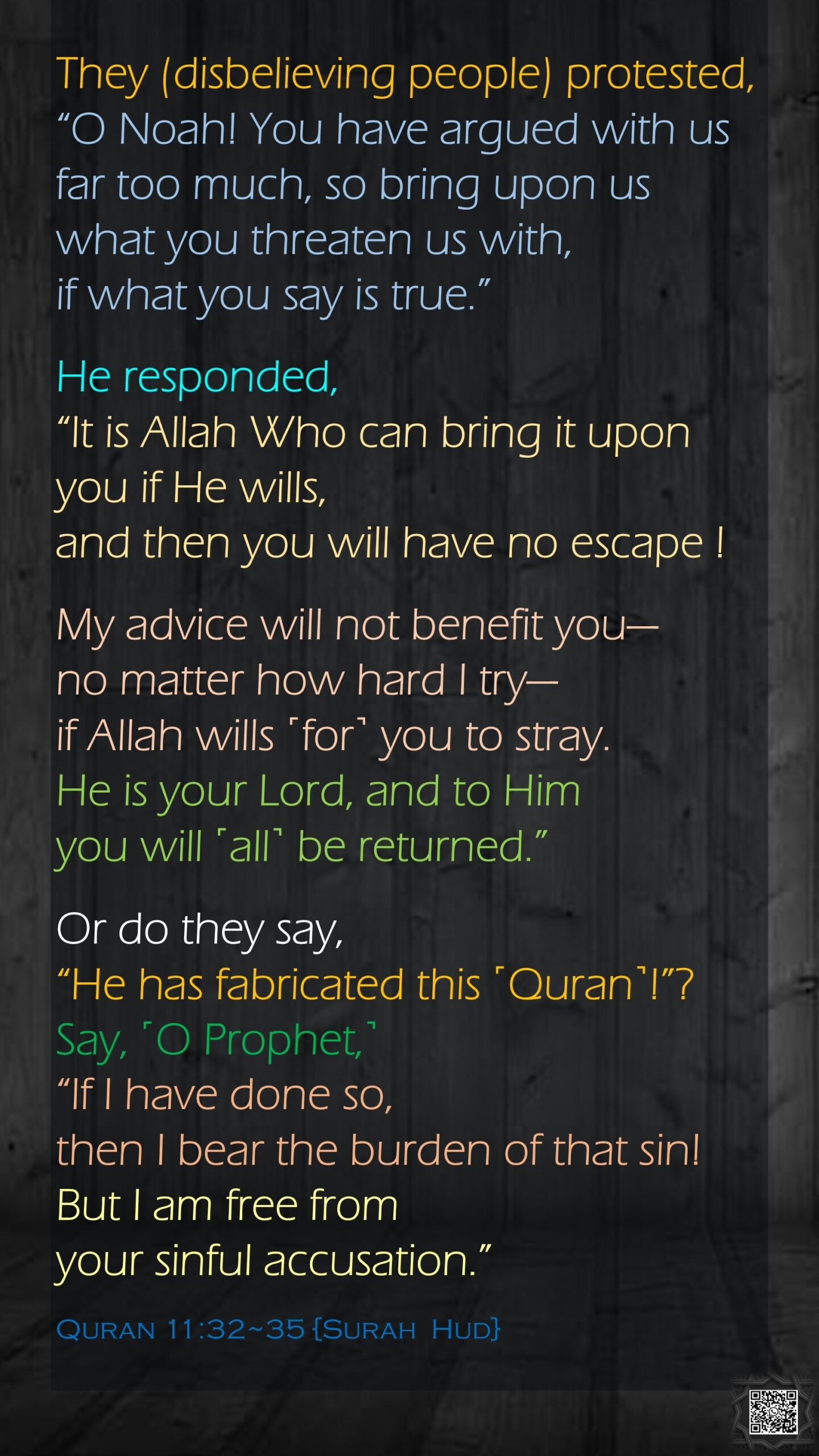 Islam, Quran 11, 34, 35, accusation, advice, Allah, Allah's Will, argue, bear, benefit, burden, daily, disbelieve, escape, fabricate, free, Hud, inspirations, islam, islamic, Muhammad, Noah, none, Nuh, people, quran, return, sin, sinful, stray, Surah, threat, will